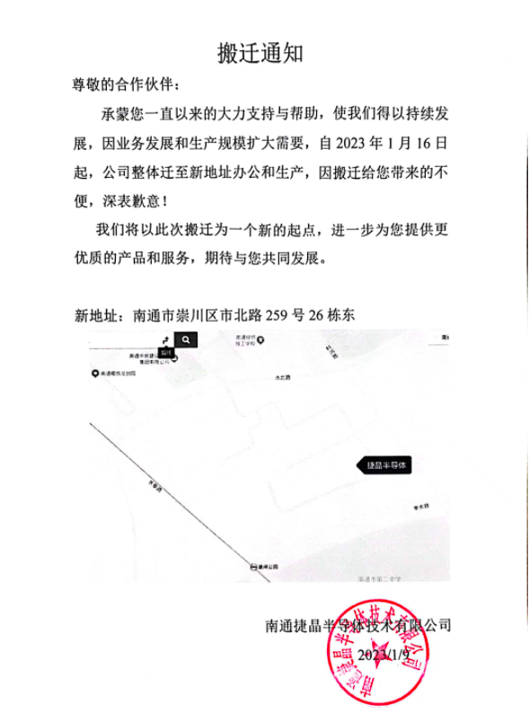 尊敬的合作伙伴:承蒙您一直以來的大力支持與幫助,使我們得以持續(xù)發(fā)展,因業(yè)務(wù)發(fā)展和生產(chǎn)的規(guī)模擴大需要。自2023年1月16日起,公司整體遷至新地址辦公和生產(chǎn),因搬遷給您帶來的不便,深表歉意!我們將以此次搬遷為一個新的起點,進一步為您提供優(yōu)質(zhì)的產(chǎn)品和服務(wù),期待與您共同發(fā)展。
